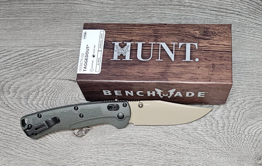 B-USA 15536TN-02 TAG*ED OUT DEEP OLIVE GREEN W/ TAN BLADE KNIFE. MADE on a BENCH in Oregon