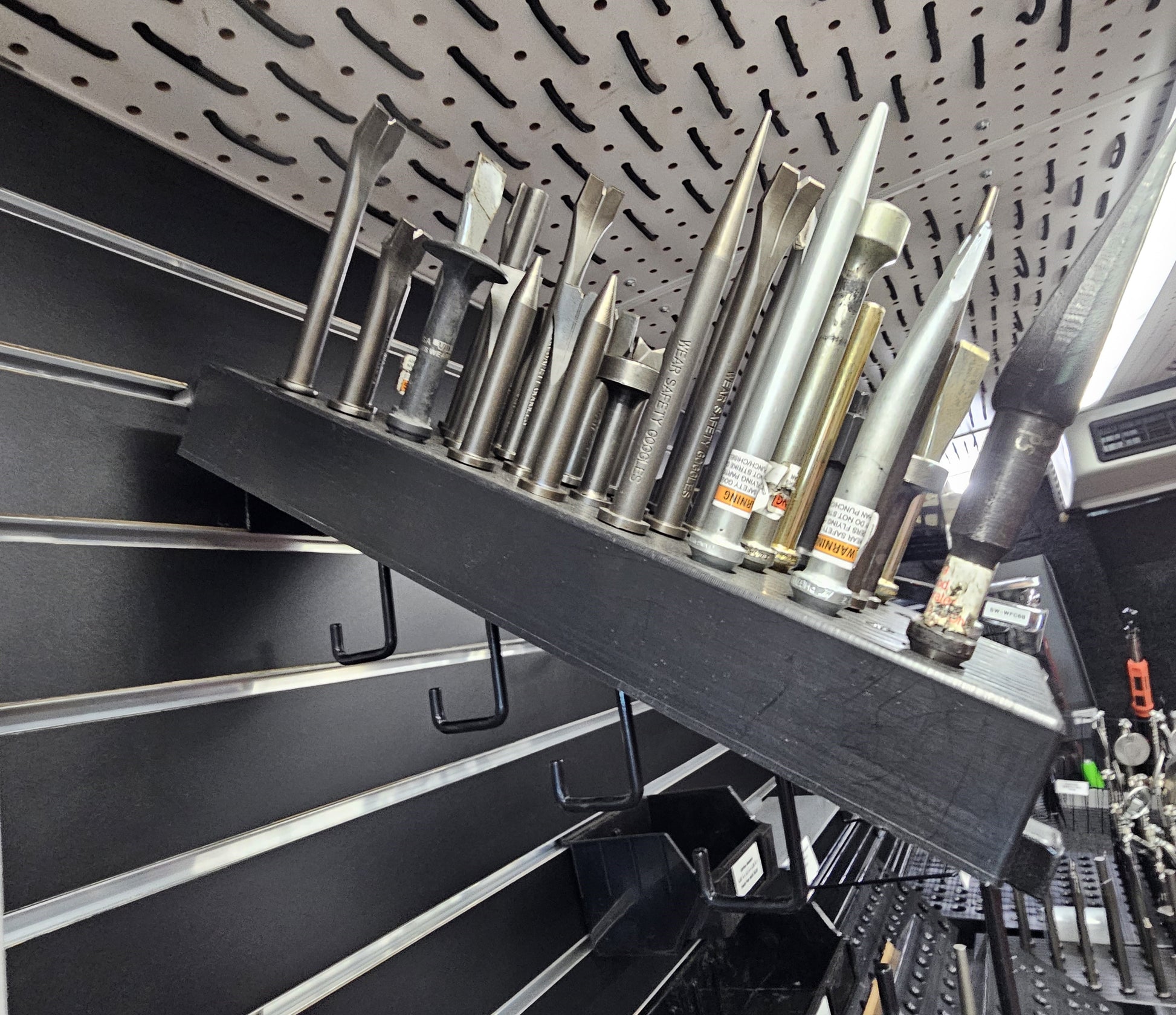 Holds 36 Air Hammer bits. Made from CNC machined High Density Polyethylene (HDPE) an ultra strong composite used in: race cars, medical and marine applications. 4 Hole sizes make for easy organization all common size punch and chisels used in auto/ truck and equipment you would typically need for your tool truck. Keep your individual most used punches and chisels nicely organized and hang more products below making the most efficient use of your space. We really like hanging gloves here as its hard to find places for gloves and they are or should be used with air hammer work.