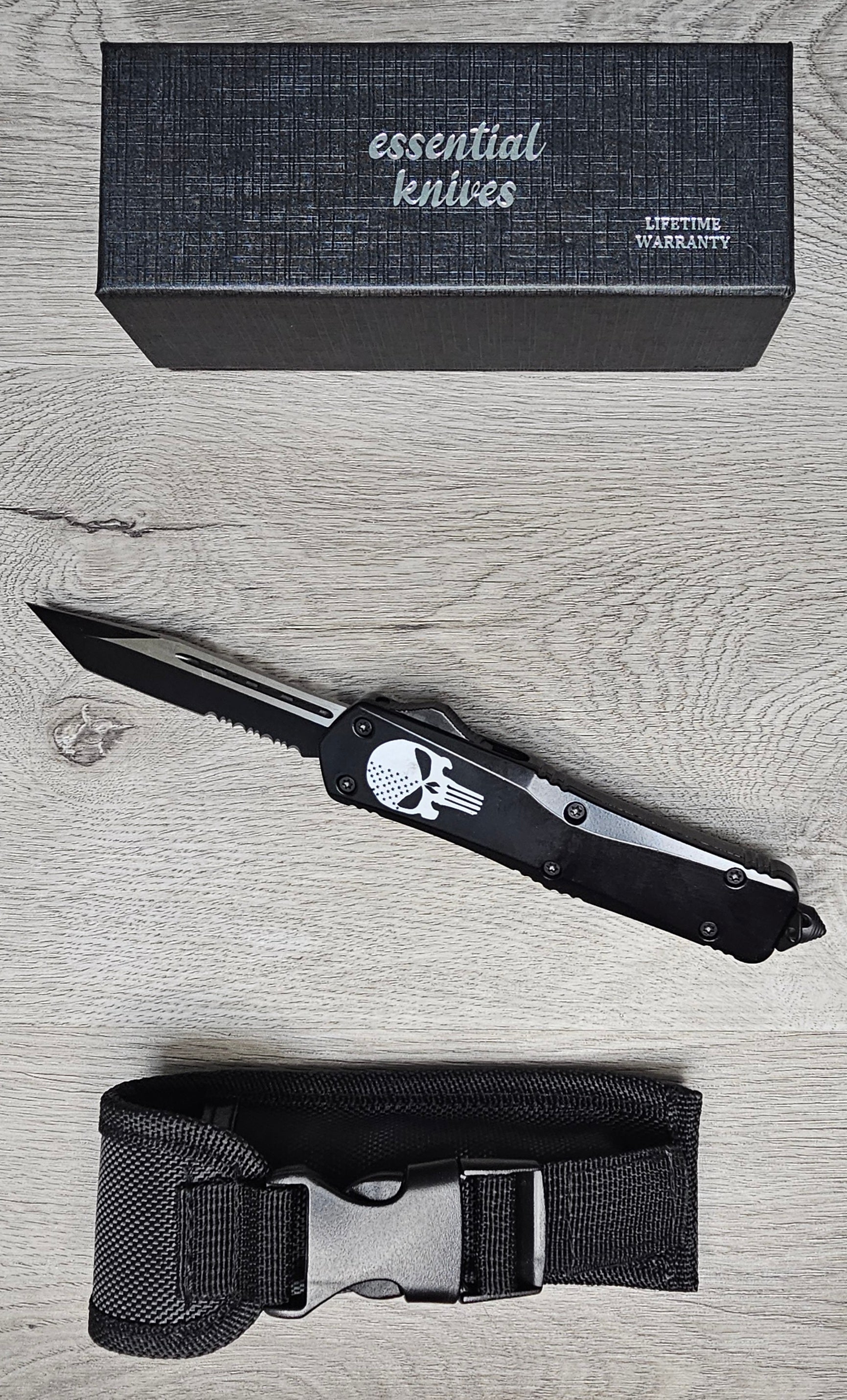 ESSENTIAL KNIVES "THE ESSENTIAL 9" SKULL Out The Front Knife TANTO SERRATED Blade